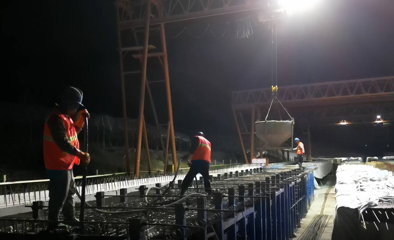 在上營(yíng)3號(hào)大橋施工過(guò)程中,項(xiàng)目部緊扣基礎(chǔ)、橋臺(tái)、橋墩、T梁等關(guān)鍵工點(diǎn)倒排工期進(jìn)行掛圖作戰(zhàn),強(qiáng)化施工資源配置,投入了吊車8臺(tái)、各型號(hào)墩柱模板約120米、各型號(hào)系梁、蓋梁模板15套,高峰期施工作業(yè)人員100余人。并針對(duì)施工作業(yè)面從根本上優(yōu)化工序、提升效率,形成多班組、多機(jī)械、模板協(xié)同作業(yè),大大提高機(jī)械設(shè)備的周轉(zhuǎn)率,加速下部構(gòu)造施工成型。針對(duì)工期緊、任務(wù)重的現(xiàn)狀,項(xiàng)目部在T梁預(yù)制過(guò)程中采取24小時(shí)不間斷施工措施,白天鋼筋綁扎,夜間進(jìn)行澆筑,創(chuàng)造了28個(gè)預(yù)制臺(tái)座,月產(chǎn)梁112片的優(yōu)異成績(jī)。