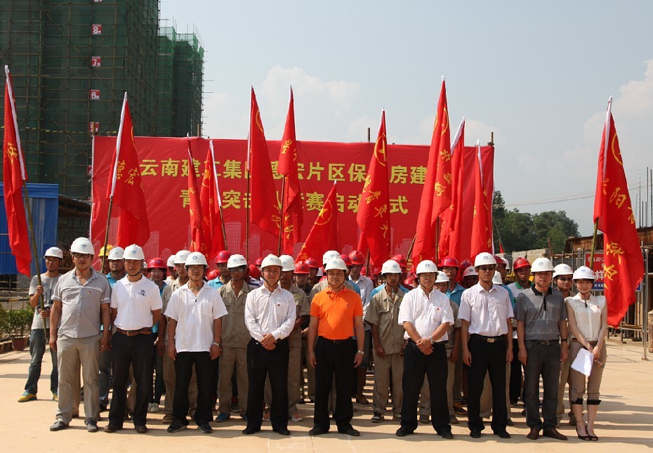 為確?!皟蓚€轉(zhuǎn)移”落地生根,全面完成好2013年保障性住房建設(shè),公司作為保障房德宏片區(qū)青年突擊隊建功競賽活動的責(zé)任單位,在該片區(qū)各項目點成立青年突擊隊,開展以比安全、比質(zhì)量、比進度、比形象為主要內(nèi)容的競賽活動。5月23日,公司團委在德宏保障性住房四A地塊舉行德宏片區(qū)保障房青年突擊隊競賽啟動儀式,共青團德宏州州委副書記李二喊過,集團團委副書記雷棲,集團指揮部副指揮長董義國,鄉(xiāng)投公司德宏分公司經(jīng)理楊照,鄉(xiāng)投公司德宏分公司書記、副經(jīng)理朱紅喜,鄉(xiāng)投公司德宏分公司總工程師王長錄等出席儀式,儀式由公司團委書記丁溪主持,九家施工單位12支青年突擊隊150余人參加啟動儀式。
