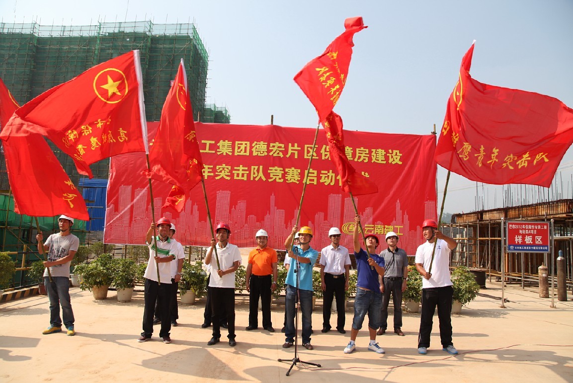 啟動儀式上,云南城鄉(xiāng)投德宏分公司經(jīng)理楊照、集團指揮部副指揮長董義國分別發(fā)表了熱情洋溢的講話,鼓勵青年突擊隊多做奉獻、多出成績,為隊旗爭光。集團團委雷書記對青年突擊隊提出要求,青年突擊隊要充分發(fā)揮青年團員干部的積極作用,在"急、難、險、重、新"項目中要充分發(fā)揮突擊隊作用和高原鐵軍精神,充分體現(xiàn)云南建投來之能戰(zhàn)、戰(zhàn)之必勝的信念,發(fā)揚特別能吃苦、特別能奉獻的傳統(tǒng),建設(shè)好芒市保障房工程,為集團爭光,給德宏州、芒市政府交一個滿意工程,給芒市人民交一個滿意答卷。隨后,參會的領(lǐng)導(dǎo)向12支青年突擊隊授予“青年突擊隊”隊旗。三公司第二經(jīng)理部副經(jīng)理兼青年突擊隊隊長張超代表十二支青年突擊隊做表態(tài)發(fā)言,表示一定遵照州市團委和集團團委的指示精神,努力工作,扎實肯干,保質(zhì)保量完成保障房建設(shè)任務(wù),做到關(guān)鍵的崗位有突擊隊員、困難的地方有突擊隊員,為隊旗爭光,為集團掙得榮譽,來回報芒市人民的厚愛。最后由德宏州團州委李書記宣布啟動儀式正式開始。